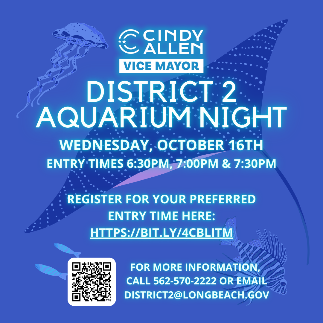 Councilwoman Cindy Allen’s District 2 Office invites you to a special event at the Aquarium of the Pacific on October 16th, from 6:30 PM to 8:30 PM! Enjoy this FREE evening of exploration and fun, and connect with fellow neighbors and discover the wonders of the aquarium after hours.