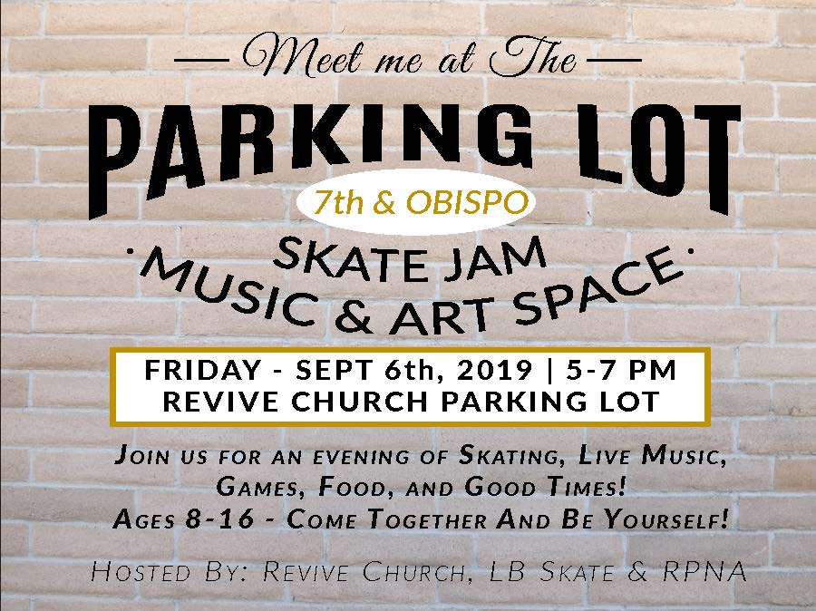 The Parking Lot at 7th & Obispo – where teens meet! This coming Friday Sept 6th. Dawn Mendelson leads the ArtWorksLBC action with a community building message! Everyone is welcomed!