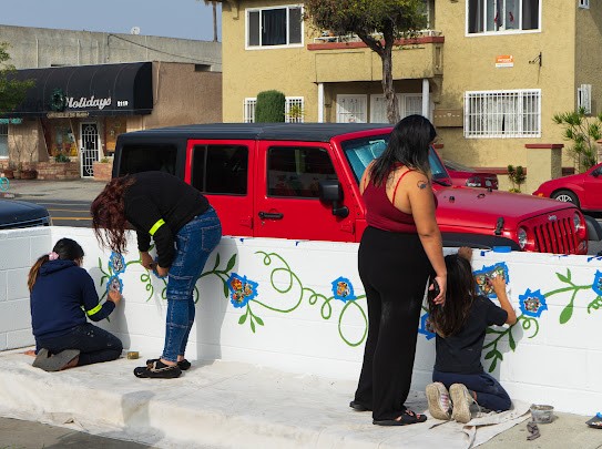 (Pictured left to right) Dawn Mendelson of ArtWorksLBC, Cody Lusby of Roses for Rose Park, Luz Mack of ArtWorksLBC and resident Sylvia Salcedo prime and paint the wall at E7th Street and Dawson Avenue on Friday, November 19th. Volunteers prepared the wall for the next installation of mosaic daisies that were created by Mann Elementary students. Thanks to Ed, Nicolette, Lupe, Ivan and dog Dixie for helping out! We also greatly appreciate the power washer provided by Jason Winters and the use of water from resident Mark Harper.
