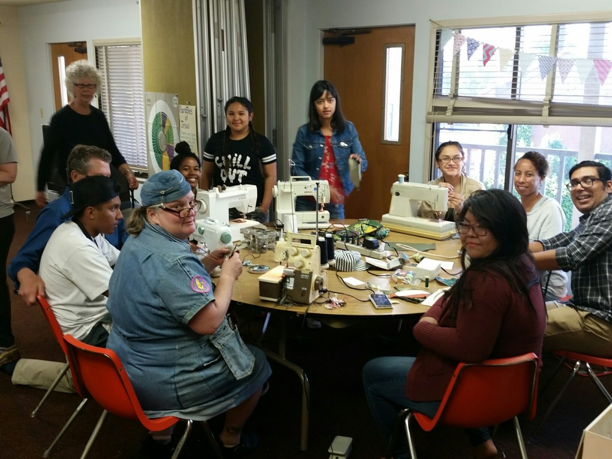 One of the outcomes of our annual BIG heART Show and Fundraiser was the two hour workshop at local Power4Youth mentoring center. On hand was Frau Fiber, a widely recognized fiber arts expert and founder of the Sewing Rebellion. Teens and their mentors got to work side by side with Frau making vintage bicycle caps and wallets. There is a lot to making things. Our participants got to discuss where they spend money on items, who makes those items in contrast with what it took for them to complete a single item. It was really well received. Thanks to Power4Youth: Val, Samana and Jessica and of course, Frau Fiber who holds sewing rebellion actions weekly in downtown LB. Check out her website. And to Scotty Benner, RP resident, nurse and artist who mentored participants on the machines, design and construction.