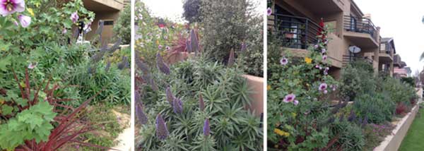 I really appreciate the garden in front of the apartment complex on the southwest intersection of 8th and Redondo. The plant placement is really smart and balanced, with tall plants covering unsightly views, shorter plants framing better views and trailing plants adding interest to an otherwise bare wall. The plants are placed with a fairly sufficient amount of space between them to sprawl out and achieve their potential girth, which can be a challenge as plants sometimes outgrow the space we set aside for them. Cheerful splashes of fuchsia and purple delight the calming color palette of soft greens and grays, and the architectural form of cordyline and bear’s breech juxtapose fluttery lavatera and silver sheen pittosporum. The elegance of this garden adds interest and beauty to the apartment building and to Redondo Avenue. It’s great example for other apartment buildings to follow!