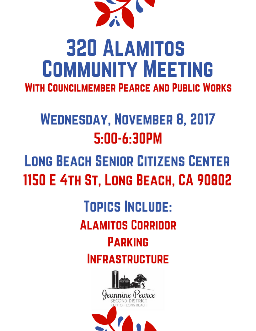 Meet and Greet at lunch time, Wednesday 12 noon-2 pm, at Rose Park on November 15th. Lola’s will be providing food and Jeannine would love for Rose Park residents to come and be a part of the conversation. The format is open topic, so anything anyone wants to talk about in regards to Long Beach and/or the 2nd District is fair game. Bring a chair!!!!