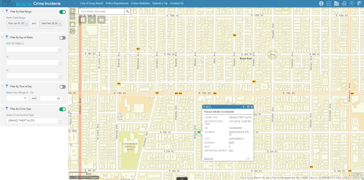 DataLB (http://datalb.longbeach.gov/) is the city’s new public GeoSpatial & Open Data Portal for exploring, visualizing and downloading data that is now publicly available.  Users are able to filter by date ranges, day of the week, time of day, and crime type.  There are over 24 different crime types to select from and each occurrence is mapped by a unique data point.  Users are able to select a data point and see detailed information like the address, date, and time of day.