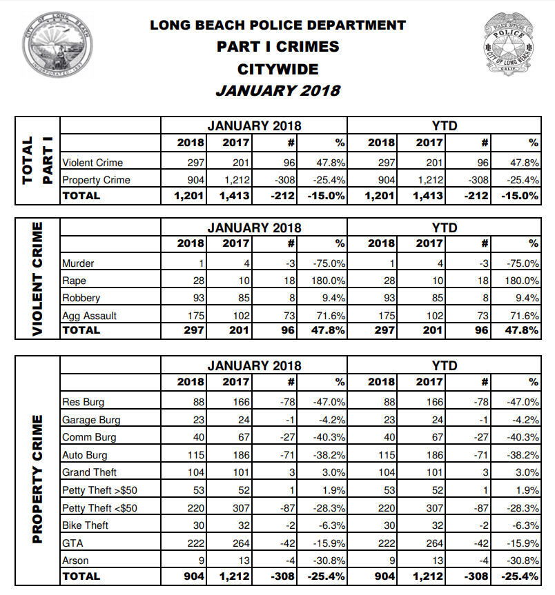 The statistical reports contain the LBPD’s monthly crime statistic data sorted by 5-year summary, previous year to current year, and reporting district.  Below is a partial view of the citywide report for January 2018.