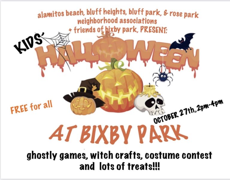 HALLOWEEN FUN AT BIXBY PARK ON OCTOBER 27TH Long Beach neighborhood associations are coming together to provide residents a FREE Halloween event at Bixby Park on Sunday, October 27th from 2pm to 4pm. Join us for games, crafts, treats and more! Wear your costume to enter the contest. Everyone welcome! HALLOWEEN CAROLING WITH LONG BEACH…